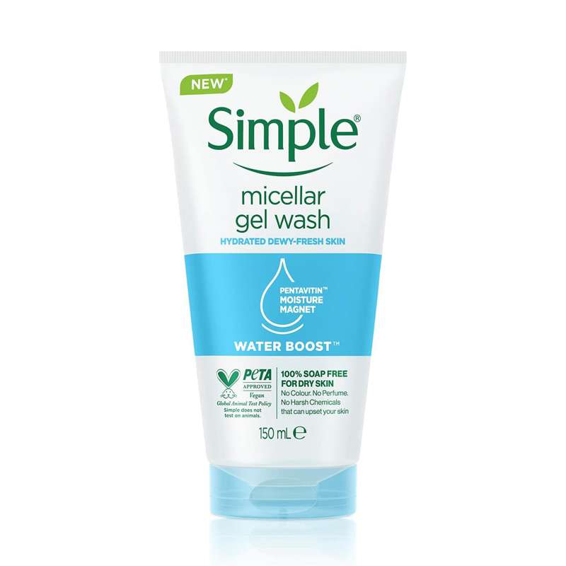 - Simple Water Boost Micellar Facial Gel Wash with micellar cleansing bubbles, gently yet effectively cleanse your face, removing dirt and make-up.